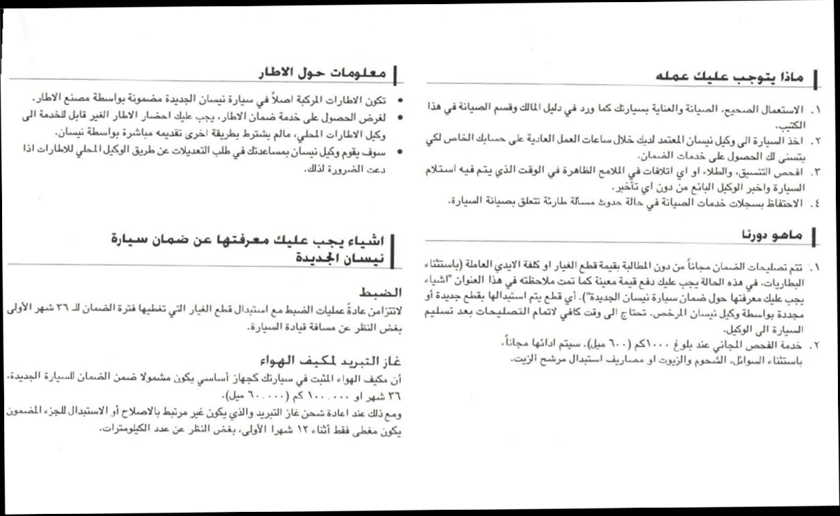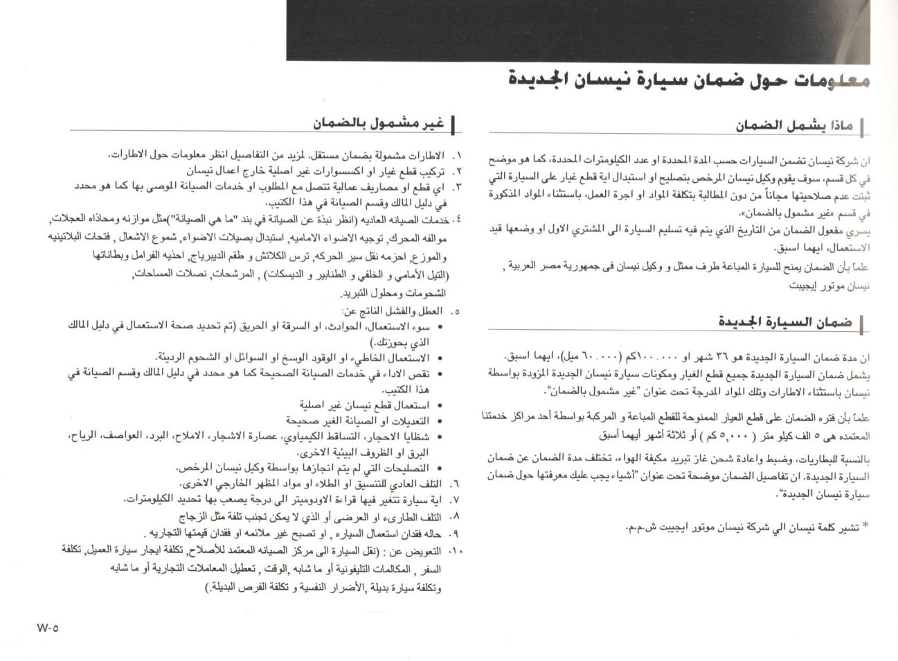 ان شركة نيسان تضمن السيارات الجديدة 36 شهر او100.000كم ايهما اسبق ، حيث يقوم وكيل نيسان المرخص بتصليح او استبدال اية قطعة غيار على السيارة التى ثبتت عدم صلاحيتها مجانا ، علما بأن فترة الضمان على قطع الغيار الممنوحه للقطع المباعة والمركبة بواسطة احد مراكز خدمتنا المعتمده هى 3 أشهر او 5.000كم ايهما اسبق .